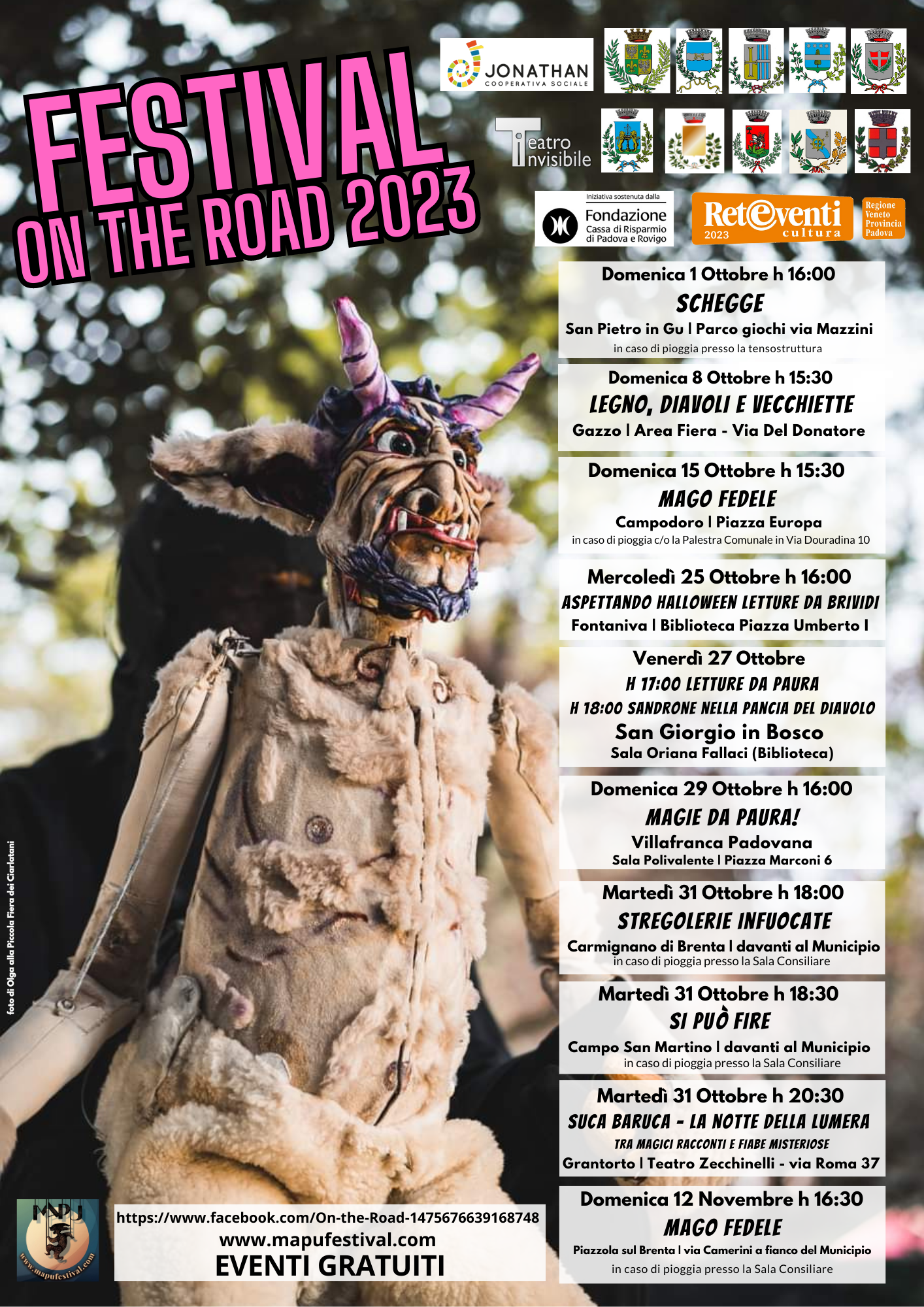 Torna anche quest’anno a colorare l’autunno il “Festival On the Road”, la kermesse di teatro di strada che, dal 1° ottobre al 12 novembre 2023, porterà in 10 Comuni dell’Alta Padovana un calendario ricco di spettacoli con pupazzi, giocolieri, maghi e raccontastorie.